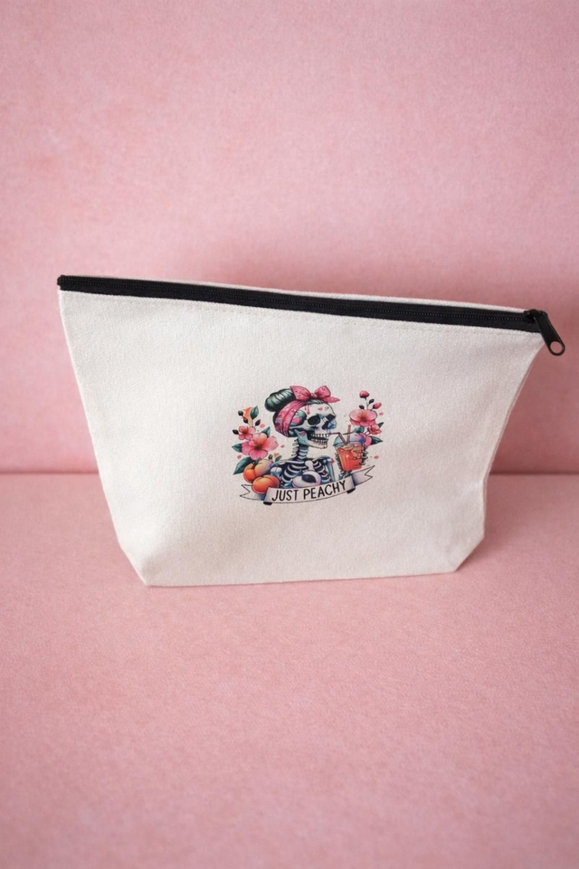 Ajoutez une touche d’originalité à votre quotidien avec cette trousse de maquillage femme au design unique “Just Peachy”. Son illustration audacieuse mêlant squelette, fleurs et fruits apporte un style à la fois tendance, féminin et décalé, parfait pour celles qui aiment se démarquer.